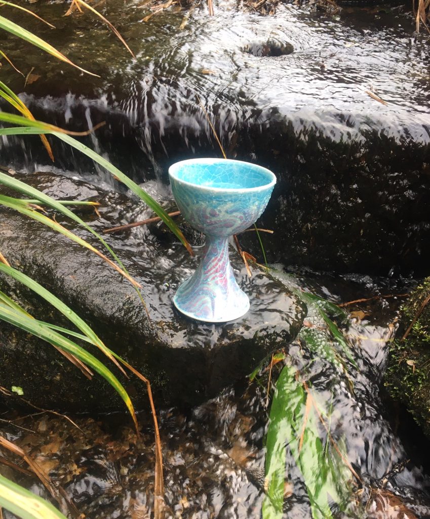 I sit quietly, slow my breathing, and let the sounds of water and touch of the breeze on my face guide me inward. When my eyes soften and my thoughts drift, the boundary between myself and the stream begins to blur. My awareness expands, alert yet deeply calm. Gradually I found myself receiving extremely clear intuitive guidance and insights, almost as if I was attending a personal session with a medium—and yes—the medium being water. Over time, I was guided to work with a glass bowl I made or a beautiful chalice, allowing the water to trickle into the receptacle and gaze at the water. This is the state in which scrying begins, a delicate balance of attention and surrender.